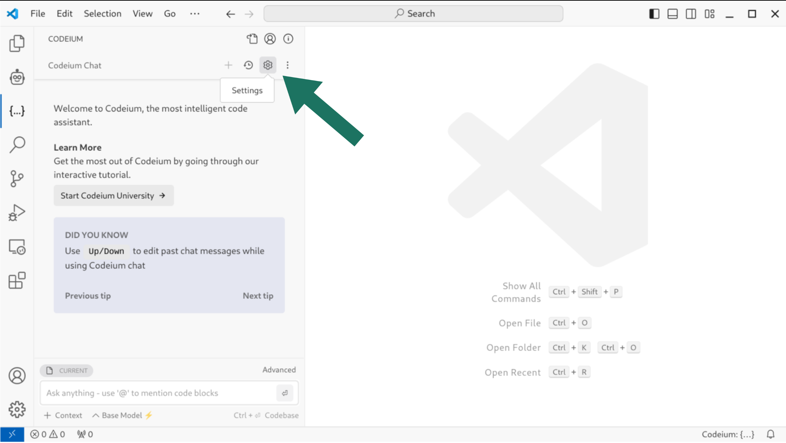 5. Select the Settings button (gear icon) in the top-right corner of the Codeium pane