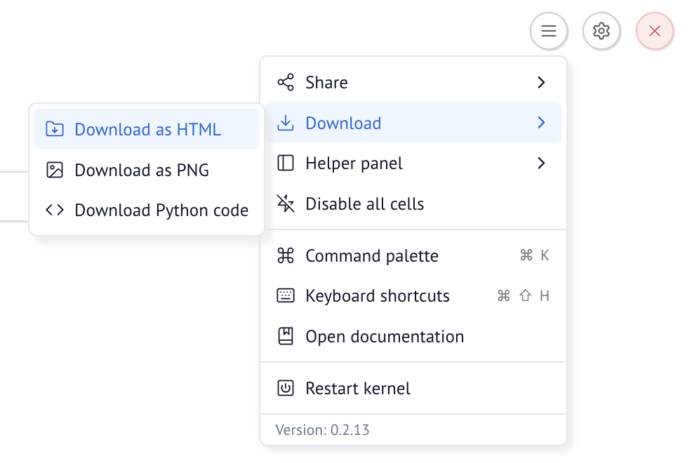 Additionally, you can configure individual notebooks to automatically save as HTML through the notebook menu. These automatic snapshots are saved to a folder called __marimo__ in the notebook directory.